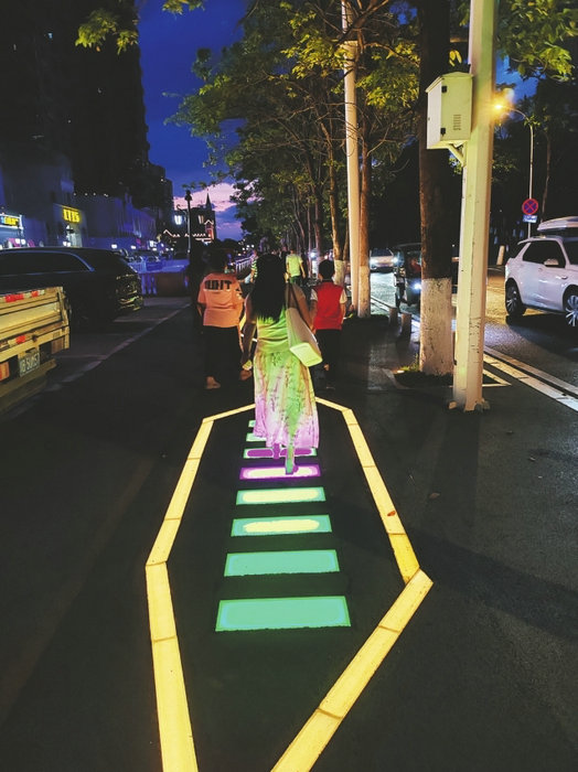 “透水混凝土具有良好滲水性能,能夠?qū)⒂晁杆贊B透到地下,減少雨水集中排放,降低洪澇風(fēng)險(xiǎn)。”三臺縣住建局城建股工作人員廖平介紹,改造后的人行道路面由碎石層、透水層、平面層組成,滲水性強(qiáng),能有效減少雨水徑流。其中,“口袋公園”附近人行道還能將雨水進(jìn)行收集儲存,達(dá)到二次利用的效果。同時,材料充分考慮防滑,并根據(jù)不同街區(qū)選取天藍(lán)、淺灰、深灰等色彩裝飾,配合建筑和路旁花草樹木,并在沿河一線道路鋪設(shè)彩燈,深受市民喜愛。