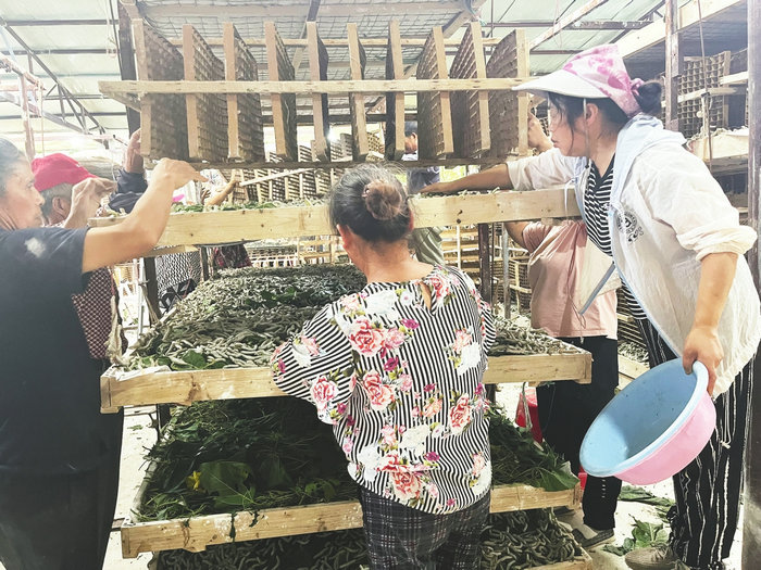 村民在養(yǎng)蠶大棚內(nèi)給蠶喂桑葉