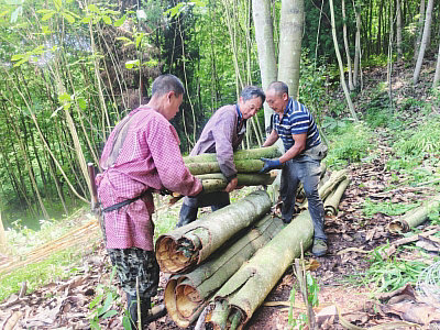 工人搬運厚樸,用無人機向山下轉(zhuǎn)運
