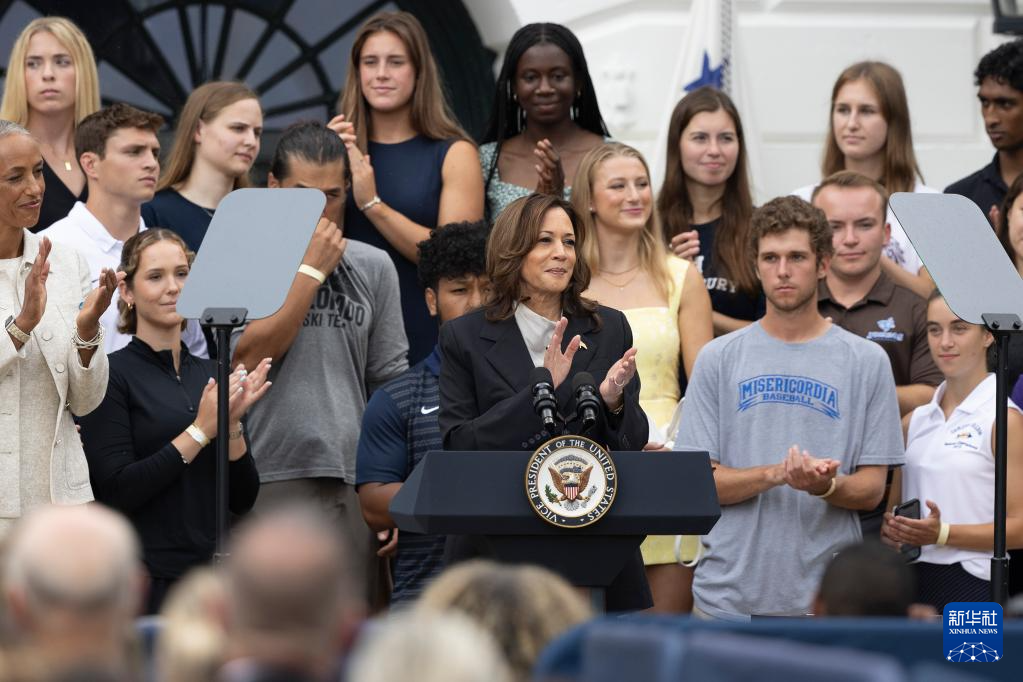 7月22日,美國(guó)副總統(tǒng)哈里斯(前中)在美國(guó)華盛頓白宮南草坪出席活動(dòng)。新華社記者 胡友松 攝