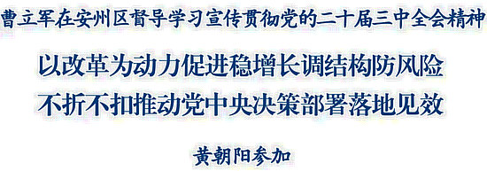 督導(dǎo)期間,曹立軍每到一處都認(rèn)真聽取學(xué)習(xí)宣傳貫徹黨的二十屆三中全會情況介紹,并向基層干部群眾宣講全會精神。他強調(diào),黨的二十屆三中全會是我們黨的歷史上又一個重要里程碑,是進(jìn)一步全面深化改革、推進(jìn)中國式現(xiàn)代化的總動員、總部署,意義重大而深遠(yuǎn)。要把學(xué)習(xí)宣傳貫徹全會精神作為當(dāng)前和今后一個時期全市上下的重大政治任務(wù),精心組織學(xué)習(xí)培訓(xùn),廣泛開展宣傳宣講,切實把思想和行動統(tǒng)一到黨中央大政方針和省委決策部署上來。要高質(zhì)量推進(jìn)國省重點改革任務(wù)落地,精心謀劃一批符合本地實際的改革舉措,注重發(fā)揮經(jīng)濟體制改革的牽引作用,深化鄉(xiāng)鎮(zhèn)抓產(chǎn)業(yè)促推高質(zhì)量發(fā)展激勵試點、綿州農(nóng)房增信貸、“鎮(zhèn)園合一”等系列自主性改革,統(tǒng)籌推進(jìn)其他各領(lǐng)域改革,把進(jìn)一步全面深化改革的戰(zhàn)略部署轉(zhuǎn)化為推進(jìn)現(xiàn)代化建設(shè)的強大力量。要把學(xué)習(xí)貫徹全會精神與做好當(dāng)前工作結(jié)合起來,緊緊把握三季度黃金期、窗口期,加強經(jīng)濟運行調(diào)度,全力以赴做好穩(wěn)投資、強產(chǎn)業(yè)、促消費、擴開放等重點工作,不斷鞏固和增強經(jīng)濟持續(xù)向好態(tài)勢,堅定不移完成全年經(jīng)濟社會發(fā)展目標(biāo)任務(wù),努力為全市發(fā)展大局貢獻(xiàn)更多力量。