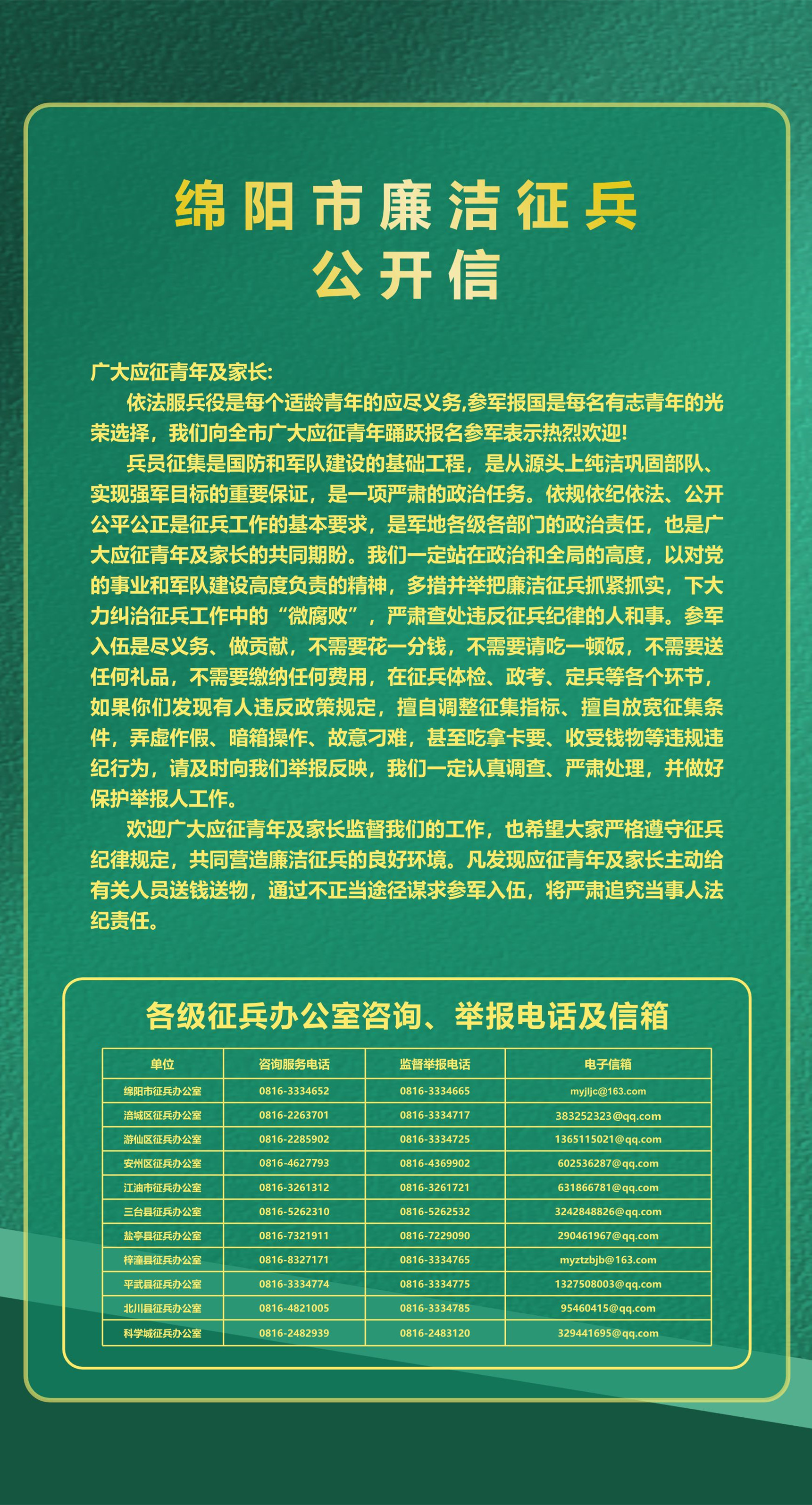 歡迎廣大應征青年及家長監(jiān)督我們的工作,也希望大家嚴格遵守征兵紀律規(guī)定,共同營造廉潔征兵的良好環(huán)境。凡發(fā)現(xiàn)應征青年及家長主動給有關人員送錢送物,通過不正當途徑謀求參軍入伍,將嚴肅追究當事人法紀責任。