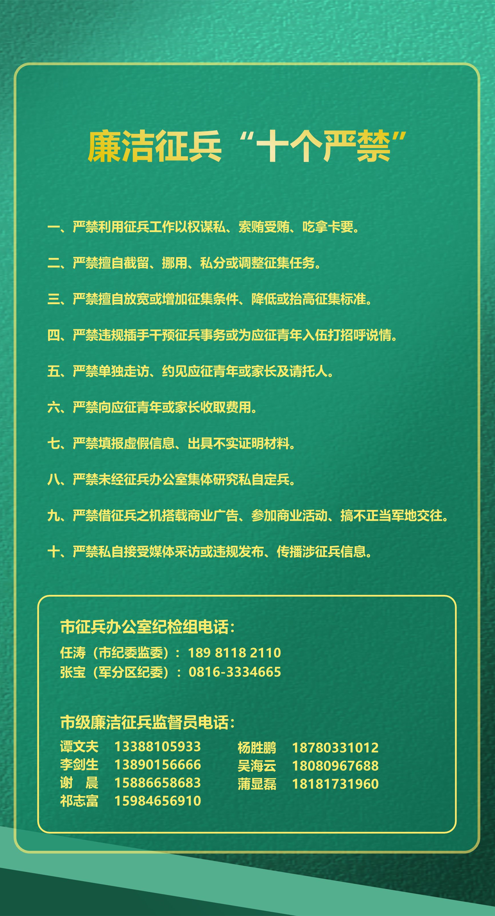兵員征集是國防和軍隊建設的基礎工程,是從源頭上純潔鞏固部隊、實現(xiàn)強軍目標的重要保證,是一項嚴肅的政治任務。依規(guī)依紀依法、公開公平公正是征兵工作的基本要求,是軍地各級各部門的政治責任,也是廣大應征青年及家長的共同期盼。我們一定站在政治和全局的高度,以對黨的事業(yè)和軍隊建設高度負責的精神,多措并舉把廉潔征兵抓緊抓實,下大力糾治征兵工作中的“微腐敗”,嚴肅查處違反征兵紀律的人和事。參軍入伍是盡義務、做貢獻,不需要花一分錢,不需要請吃一頓飯,不需要送任何禮品,不需要繳納任何費用,在征兵體檢、政考、定兵等各個環(huán)節(jié),如果你們發(fā)現(xiàn)有人違反政策規(guī)定,擅自調整征集指標、擅自放寬征集條件,弄虛作假、暗箱操作、故意刁難,甚至吃拿卡要、收受錢物等違規(guī)違紀行為,請及時向我們舉報反映,我們一定認真調查、嚴肅處理,并做好保護舉報人工作。