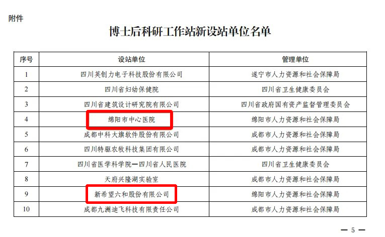 近日,四川省人社廳發(fā)布獲批新設(shè)博士后科研工作站名單,綿陽(yáng)市的市中心醫(yī)院、新希望六和股份有限公司2家單位名列其中,將分別獲省、市資助資金60萬(wàn)元。其中,綿陽(yáng)所入選單位數(shù)量在地級(jí)市中排名第一。