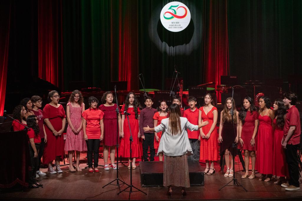 6月3日,在巴西北里奧格蘭德州納塔爾舉行的“慶祝中國巴西建交50周年——巴西東北部中巴音樂巡演(納塔爾場)”音樂會上,北里奧格蘭德聯(lián)邦大學(xué)的戚楠老師指揮巴西小朋友們合唱《茉莉花》。 新華社記者王天聰攝