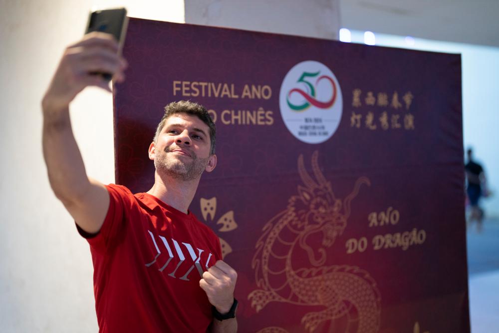2月3日,在巴西累西腓,一名男子在中國巴西建交50周年紀(jì)念標(biāo)識前拍照留念。中國春節(jié)慶?;顒?日在巴西東北部城市累西腓的林度夫人公園舉行。 新華社記者王天聰攝