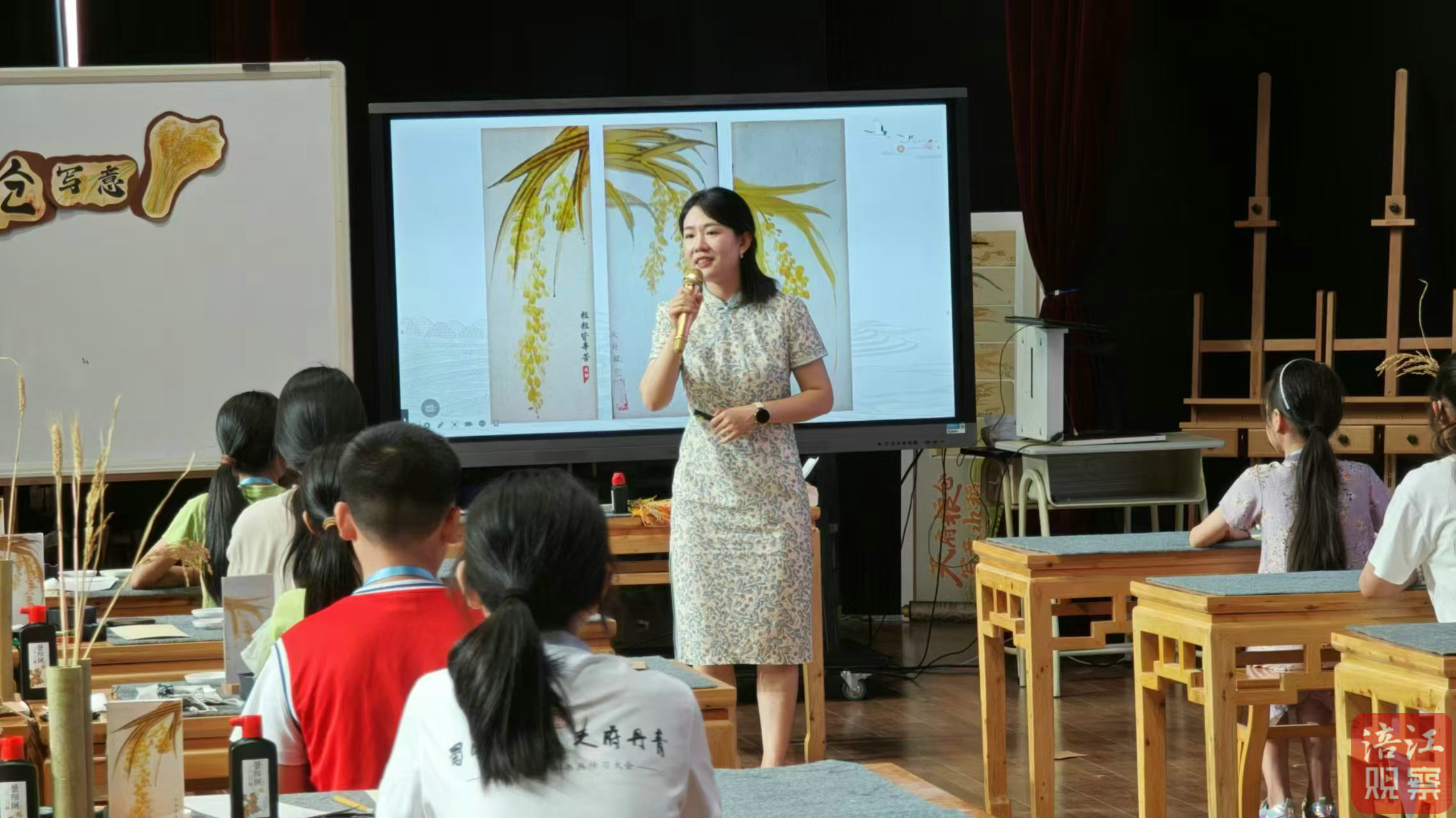 在第一場(chǎng)公開課上,來自成都高新區(qū)實(shí)驗(yàn)小學(xué)新川分校的老師周婷以《天府糧倉—寫意水稻》為題,向大家教學(xué)中國(guó)畫。周婷借助一段視頻引入水稻,讓孩子們?cè)敿?xì)觀察水稻的形狀和色彩,再通過名家大師的作品講解和分析水稻的繪畫技巧和風(fēng)格。課堂上,孩子們與老師積極互動(dòng),并在老師的引導(dǎo)下作畫。汪雨欣同學(xué)欣喜不已:“今天我學(xué)習(xí)了周老師的國(guó)畫課程,從中掌握了國(guó)畫的用筆、用墨、用色技法……”
