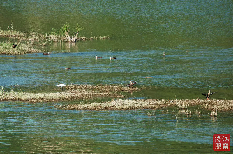 在這里,白鷺、斑嘴鴨、赤麻鴨成為了最靈動(dòng)的風(fēng)景線。它們在江畔淺水處悠然自得,或低頭覓食,或展翅高飛,或悠閑地在水里游來游去,像是大自然精心編排的舞蹈,令人賞心悅目。