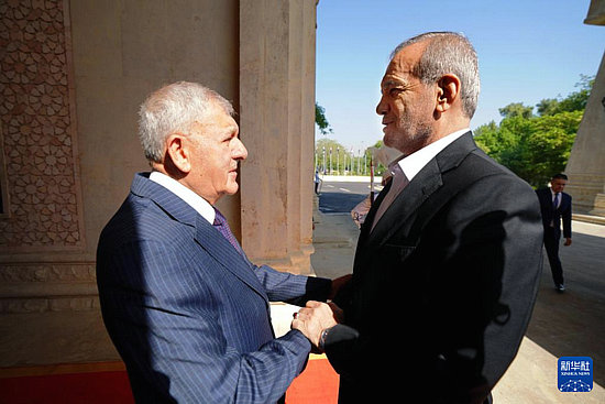 9月11日,伊拉克總統(tǒng)拉希德(右)在首都巴格達(dá)同到訪的伊朗總統(tǒng)佩澤希齊揚(yáng)舉行會談。新華社發(fā)