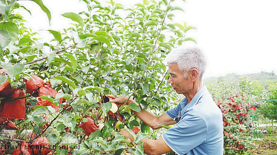 據(jù)果農(nóng)許智兵介紹,蘋果幼果成長階段套袋后,不僅隔離農(nóng)藥與環(huán)境污染,而且可以減少病蟲害直接傷害果面,從而使成熟水果表面光潔,提高水果檔次。在秋季果實(shí)成熟快下樹的前10天左右,需要脫掉紙袋,在陽光、溫差的作用下可迅速著色,白玉色的蘋果便會(huì)魔術(shù)般變成紅彤彤的成品果。許智兵一邊悉心勞作,一邊介紹著,眼里滿是豐收的喜悅。