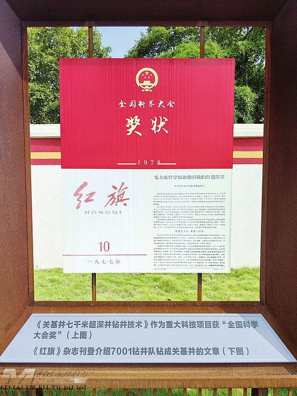 在小院外右側(cè)圍墻上,是關(guān)基井的地理位置、問世時間、獲得榮譽等的簡介。簡介記載,關(guān)基井于1974年12月17日開鉆,1977年12月4日完鉆,井深7175米,保持亞洲第一深井紀錄長達25年,創(chuàng)造了我國鉆進深度最深、地層壓力最高等10項紀錄,榮獲“全國科學大會獎”“四川省科學技術(shù)獎一等獎”等,讓中國成為世界上第四個能鉆探7000米以上超深井的國家,是一口名副其實的“爭氣井”。