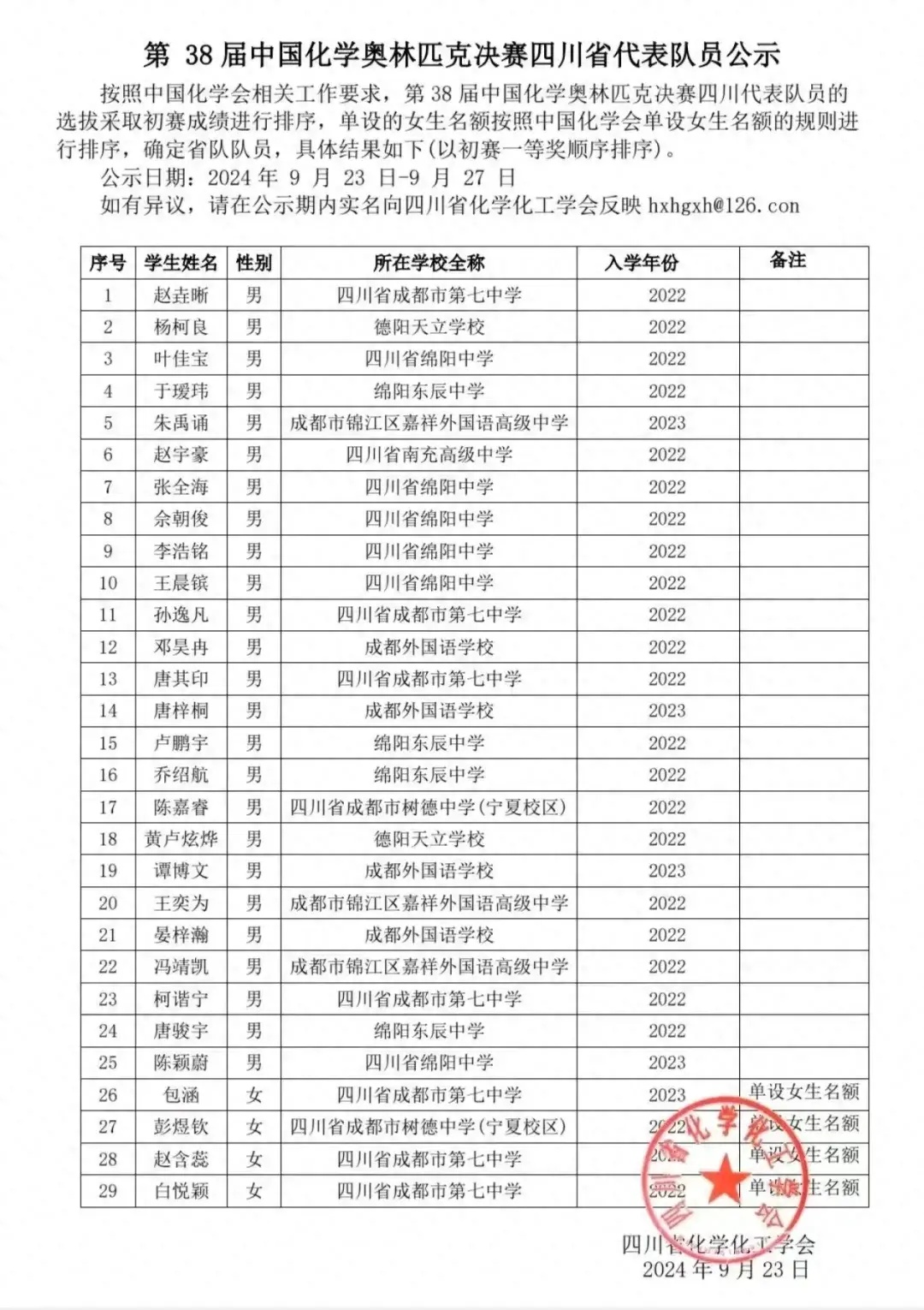 第38屆中國化學(xué)奧林匹克決賽四川省代表隊(duì)名單公示