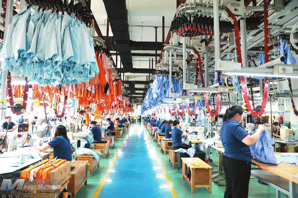 在大多數(shù)人印象中,服裝紡織行業(yè)屬于傳統(tǒng)工業(yè)中的勞動密集型產(chǎn)業(yè)。然而,記者在現(xiàn)場看到,第四車間已經(jīng)引入了一條自動智能吊掛生產(chǎn)線,上一個(gè)環(huán)節(jié)的工人只需把半成品掛到吊掛機(jī)上,就自動運(yùn)輸?shù)较乱粋€(gè)工序進(jìn)行下一步的生產(chǎn)。