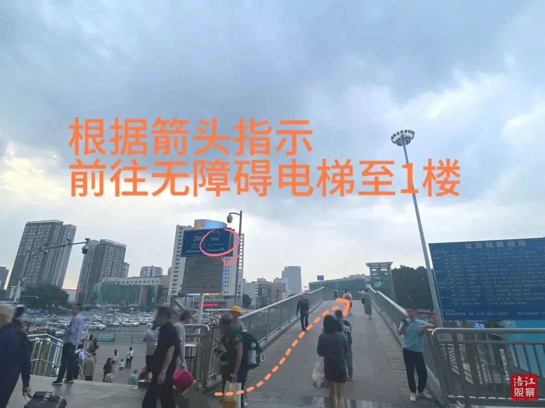 到達綿陽站出站口,根據(jù)指示牌“公交車乘車點”,向右前方通過天橋,乘坐無障礙電梯到達一樓,左轉(zhuǎn)步行至免費304空港專線乘車。