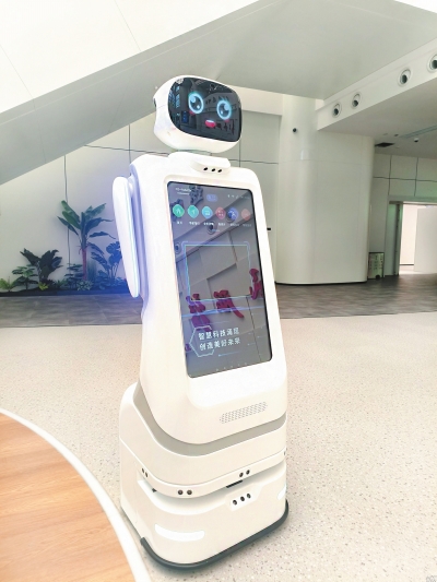 走進新政務(wù)服務(wù)中心大廳,迎面而來的除了面帶微笑的前臺工作人員,還有熱情的“導(dǎo)服”機器人。