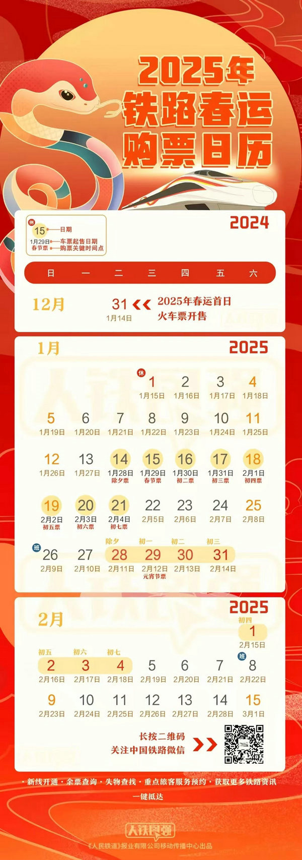 2025年鐵路春運(yùn)自2025年1月14日開(kāi)始,至2月22日結(jié)束,為期40天。全國(guó)鐵路預(yù)計(jì)發(fā)送旅客5.1億人次,節(jié)前客流高峰日預(yù)計(jì)為1月25日(臘月廿六),節(jié)后客流高峰日預(yù)計(jì)為2月4日(正月初七)。