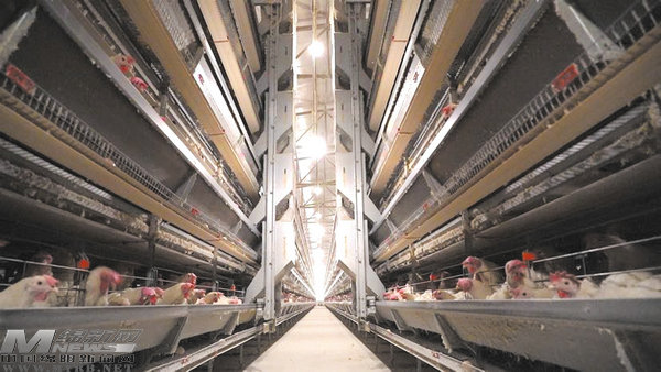 雞舍里,一排排標準化層疊式蛋雞籠整齊排列著,隨著全自動化飼養(yǎng)系統(tǒng)啟動,飼料均勻地撒在食槽內(nèi),成千上萬只蛋雞競相啄食,不時有雞蛋滾進食槽下方的收蛋槽內(nèi)。