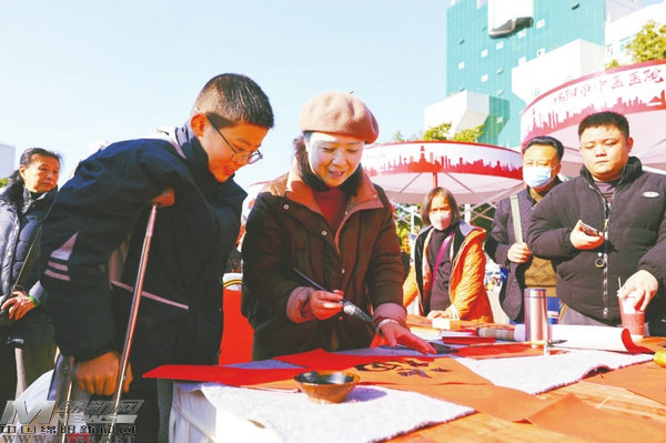 在中醫(yī)非遺項目特色體驗區(qū),綿陽市中醫(yī)醫(yī)院的醫(yī)生現(xiàn)場問診,市民排著長隊沉浸式體驗中醫(yī)傳統(tǒng)特色文化,爭相選購特色中醫(yī)藥產品、香囊等;在漢服體驗區(qū),精美的衣飾,配套的發(fā)簪、絨花、耳墜等飾品,吸引了很多愛好者一邊參觀,一邊沉浸式體驗傳統(tǒng)服飾之美;在書法展區(qū),專業(yè)老師揮毫潑墨,一個個寓意祥和的“福”字,一副副充滿喜氣的春聯(lián)躍然紙上;在舞臺區(qū)的城市路演主題活動中,飛花令、全民K歌輪番上演,福袋、綿陽文創(chuàng)等各式禮品發(fā)不停……各式各樣的互動環(huán)節(jié)讓市民和游客在逛大集、購好品的同時,體驗到豐富多彩的文化盛宴。