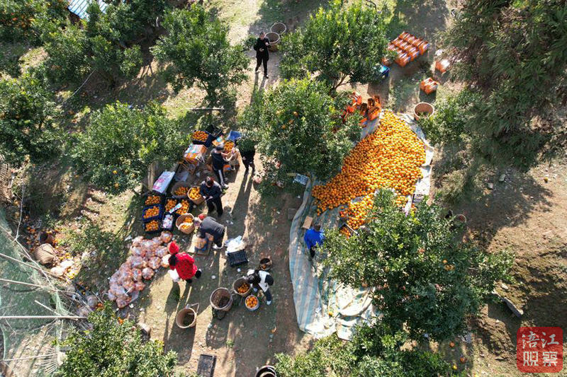 1月11日上午,陽光明媚,驅(qū)散了冬日寒冷。記者再次來到綿陽市高新區(qū)永興鎮(zhèn)(河邊場)銀花湖村,夏進明爺爺?shù)墓麍@空地上堆滿了剛采摘下來的椪柑。夏爺爺?shù)膬鹤?、孫子及鄰居都在麻利地分袋、裝箱,準備發(fā)貨。三三兩兩驅(qū)車自發(fā)來采摘椪柑的游客穿行在果樹林里,采摘、品嘗鮮果的歡聲笑語此起彼伏。