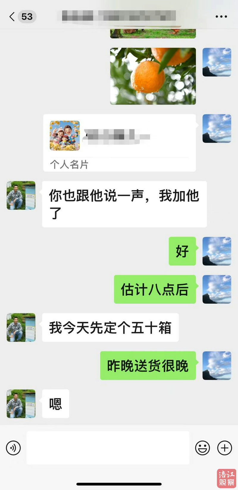 “我轉(zhuǎn)發(fā)了《涪江觀察》的新聞到朋友圈,外地的朋友也想購買。今天先訂50箱,幫夏爺爺賣些柑橘。”1月11日一大早,“蜜蜂博士”張玉波就聯(lián)系記者表達了自己的心愿,并隨即添加了彭女士微信,要求當天發(fā)貨到北京。