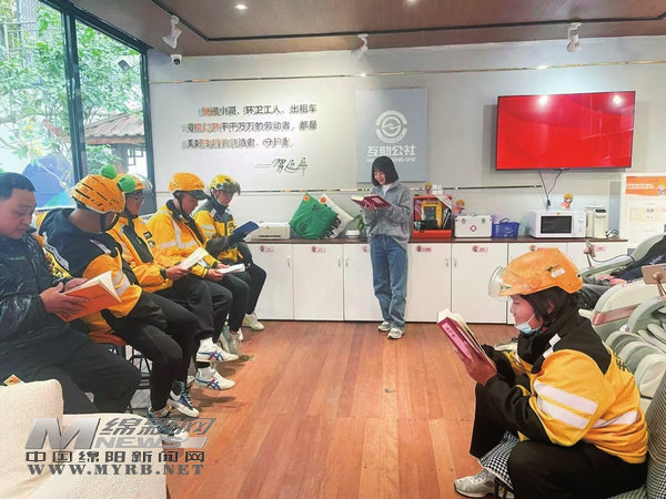 在涪城區(qū)華豐社區(qū)暖“新”驛站,外賣騎手們正在進(jìn)行讀書分享。