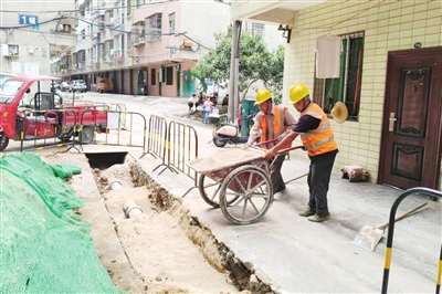 游仙區(qū)老舊小區(qū)居民自建房小區(qū)消防設(shè)施改造項(xiàng)目現(xiàn)場,工人正在進(jìn)行管道的鋪設(shè)與填埋工作。
