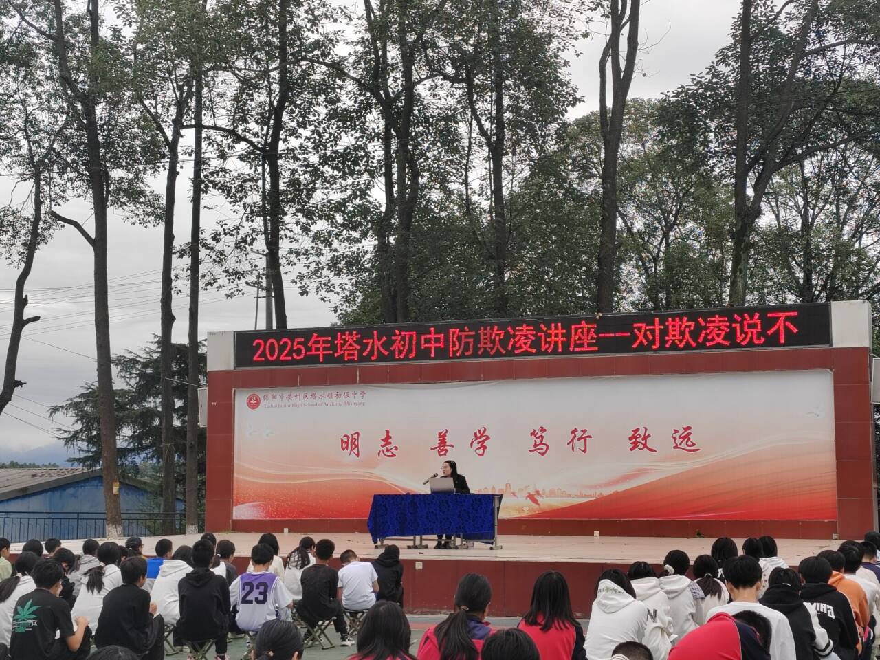 為了營造和諧安全的校園環(huán)境,守護學生健康成長,10月17日上午,安州區(qū)塔水鎮(zhèn)初級中學在內(nèi)操場開展了以“警校攜手筑防線,向校園欺凌‘亮劍’”為主題的2025年秋防欺凌主題教育講座活動,特別邀請該校法制副校長、安州區(qū)人民法院孫洋法官擔任主講,為全校學生上了一堂生動的法治教育課。