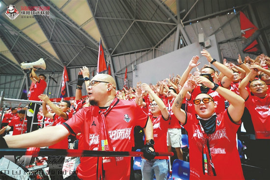看臺上,為綿陽隊(duì)助威的旗陣“遍地開花”。
