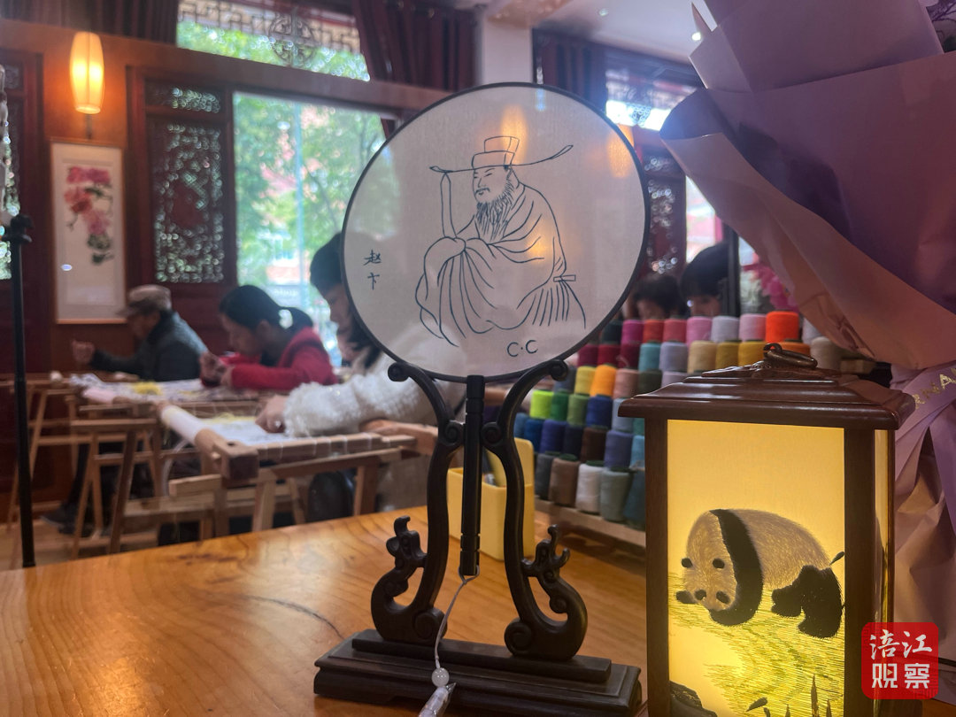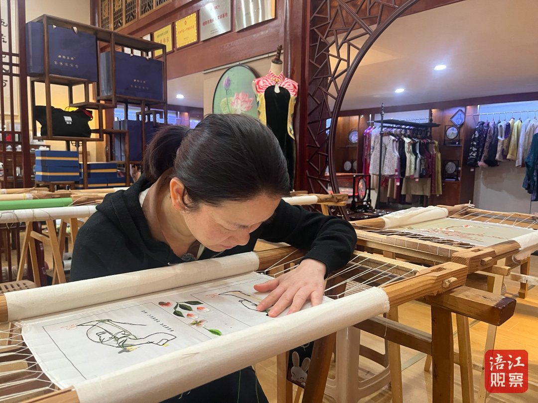 繡架前,學(xué)員陳建蓉的身影格外引人注目。她的右眼失明,左眼視力僅0.1,因此她需要將臉貼近繡布才能辨識(shí)針腳。但就在這樣的狀態(tài)下,“李白舉杯邀明月”的詩意畫卷一針一線地緩緩呈現(xiàn)。