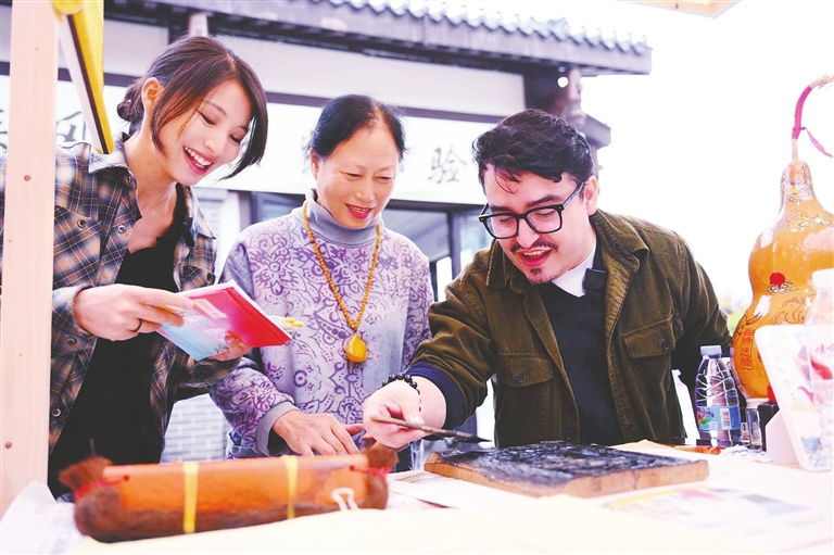 在“多彩綿陽 ·熱烈滾燙”城市推廣活動第二場非遺專場非遺體驗區(qū),外國游客體驗梓潼木刻年畫。