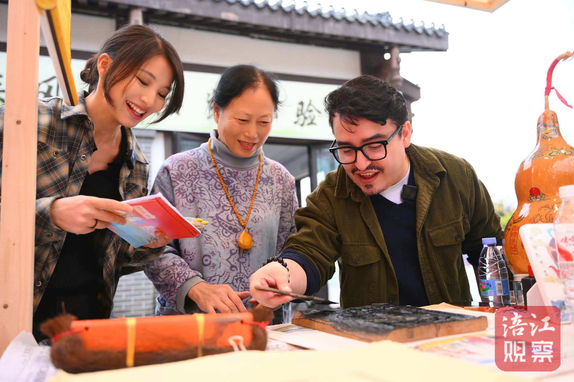 在非遺體驗(yàn)區(qū),游客們跟著非遺傳承人親手解鎖“老綿陽(yáng)的浪漫”。省級(jí)非遺項(xiàng)目梓潼木刻年畫代表性傳承人羅智婉,用刷子將墨水刷勻,再將毛邊紙平鋪于木板上,最后用趟子由上至下印制,一幅完整的作品就誕生了。最后再落款、蓋章,幾分鐘時(shí)間,一幅屬于游客的梓潼木刻年畫作品就誕生了!