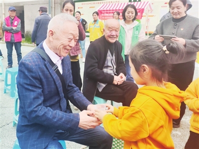 ?、僭诎仓輩^(qū)雎水鎮(zhèn),小朋友將熱茶送到老人手中。