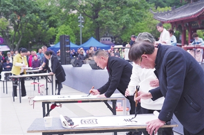 ③綿陽開放大學老年學員揮毫潑墨,展示學習成果。