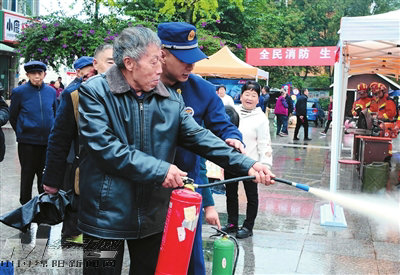 市民在消防員的指導(dǎo)下,學(xué)習(xí)滅火器使用方法。 記者 唐舒琪 攝