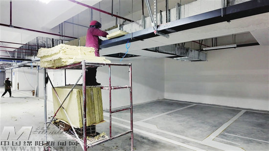 安州區(qū)智慧停車場及配套建設(shè)項目現(xiàn)場,工人正在安裝防火包裹。