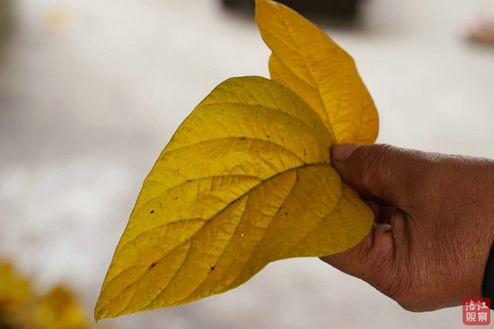 劉從林說:“采摘技術(shù)不難,只要沒有蟲眼就行。像這種有蟲眼的就不能要,要選黃色的、沒有病斑的。葉子黃了就可以摘,一天摘50斤完全沒問題。”
