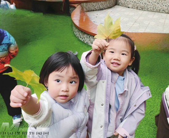 開元實驗幼兒園的孩子展示五彩斑斕的樹葉。 記者 李錦輝 攝