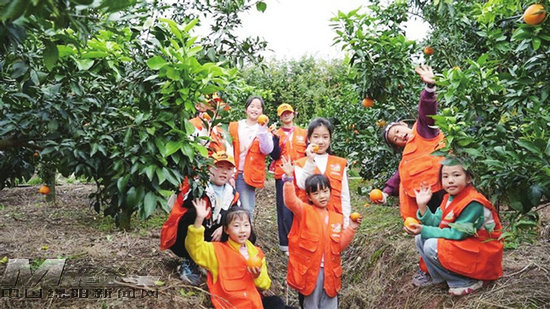 “橙園課堂”上,老師教孩子們通過顏色、手感和重量判斷橘子成熟度。講解完畢,孩子們分工合作,高個子摘高處果實,矮個子撿低處橘子,果園里滿是驚喜的呼喊。