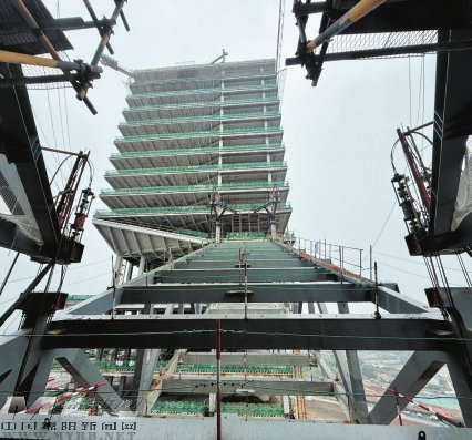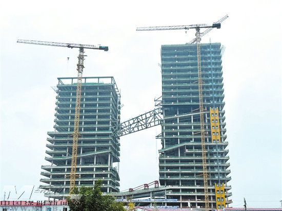 記者在現(xiàn)場看到,項目主體結(jié)構(gòu)已經(jīng)基本成型,工人們在各自崗位上來回穿梭,機械聲、電焊聲不絕于耳,一片繁忙的景象。兩幢高樓之間,一座鋼連廊懸空而架,看上去十分壯觀。
