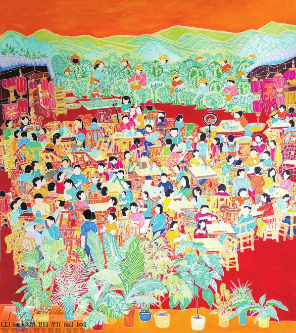 楊若雪的《茶香傳薪新·享茶品豐饒》,以幾何化梯田、圓桌茶宴構(gòu)建畫面秩序感,夸張變形的人物輪廓與茶樹形態(tài)釋放出情感張力,形成“拙中藏巧”的視覺語言。作品前半部分,茶農(nóng)古法采茶、曬青、炒制的場(chǎng)景,與網(wǎng)絡(luò)直播賣茶的光影交織,傳統(tǒng)技藝與數(shù)字浪潮在茶香中完成對(duì)話;后半部分,游客圍坐茶宴,笑語隨茶湯漾開,品茗被升華為一場(chǎng)鄉(xiāng)村美學(xué)儀式。作品以“薪火”延續(xù)文化基因,以“豐饒”描繪產(chǎn)業(yè)圖景,在鄉(xiāng)土煙火中熔鑄時(shí)代精神,觀者既能看見茶山律動(dòng),亦能品讀鄉(xiāng)村振興的壯闊史詩。