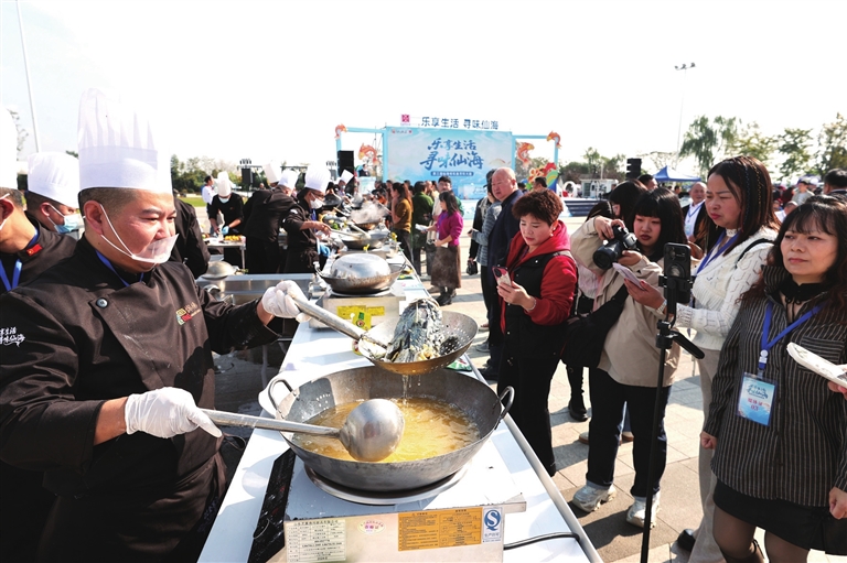 賽場外,多元互動活動人氣爆棚。中國烹飪大師蒙眼展示切腰花絕技,刀工精準利落,盡顯匠心魅力;20公斤以上的鮮活仙海大魚競拍環(huán)節(jié),餐飲企業(yè)爭相舉牌;展區(qū)內(nèi),仙海名特優(yōu)產(chǎn)品整齊陳列,本地特色美食供游客免費品鑒,讓大家一站式感受仙海風味;由參賽菜品組成的20桌“全魚宴”更是座無虛席,游客在品嘗美味的同時,盡享視覺與味覺的雙重盛宴。