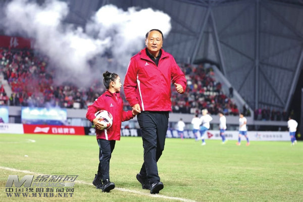 10月25日晚,川超綿陽九洲長虹隊對陣廣元劍門雄關(guān)隊的比賽現(xiàn)場,中國工程物理研究院(簡稱“中物院”)老一輩科研工作者子弟、四川省足球協(xié)會原秘書長李日新,與中物院新生代科研工作者子女、綿陽科學(xué)城春蕾學(xué)校學(xué)生韓思媛,攜手為比賽開球。