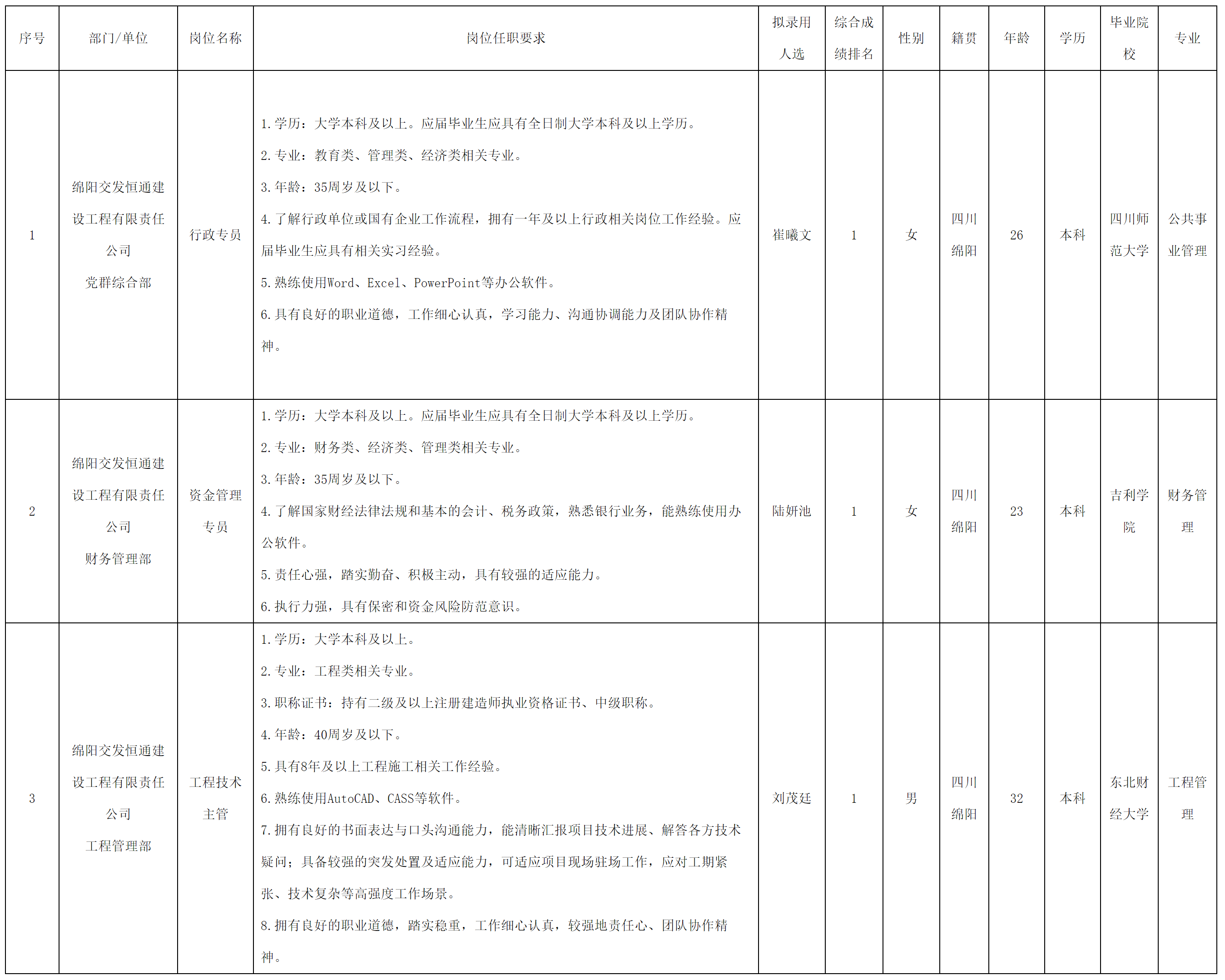 根據(jù)我司發(fā)布的招聘公告及招聘相關(guān)規(guī)定,經(jīng)初試、復(fù)試、體檢、背景調(diào)查等程序,擬錄用崔曦文等3名同志到綿陽(yáng)交發(fā)恒通建設(shè)工程有限責(zé)任公司工作,現(xiàn)予以公示,具體情況如下: