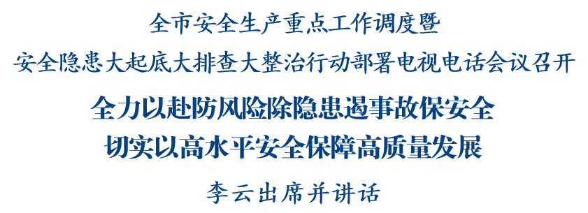 11月28日,全市安全生產(chǎn)重點(diǎn)工作調(diào)度暨安全隱患大起底大排查大整治行動(dòng)部署電視電話會(huì)議召開(kāi),分析當(dāng)前安全生產(chǎn)形勢(shì),安排部署下一步工作,市委副書(shū)記、市長(zhǎng)李云出席會(huì)議并講話,強(qiáng)調(diào)要深入學(xué)習(xí)貫徹習(xí)近平總書(shū)記關(guān)于安全生產(chǎn)的重要論述,認(rèn)真落實(shí)中央和省市部署要求,時(shí)刻繃緊安全生產(chǎn)工作思想之弦,全力以赴防風(fēng)險(xiǎn)、除隱患、遏事故、保安全,切實(shí)以高水平安全保障高質(zhì)量發(fā)展。