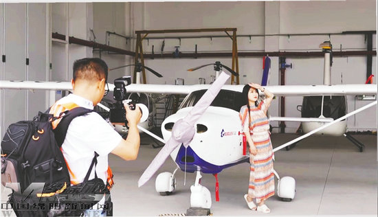 在北川永昌機(jī)場(chǎng)機(jī)庫內(nèi),游客在飛機(jī)機(jī)身前拍照留念。視覺綿陽資料圖片