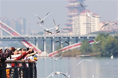 連日來,大批游客打卡三江半島,與紅嘴鷗互動(dòng)嬉戲,成為獨(dú)特的城市風(fēng)景線。 記者 陳冬冬 攝