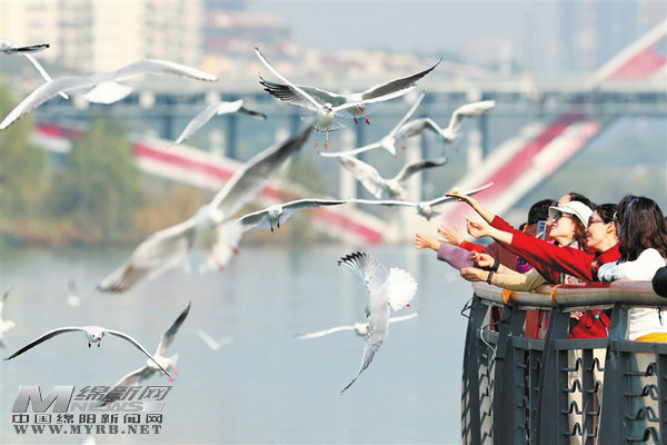 游客打卡三江半島,與紅嘴鷗互動嬉戲。