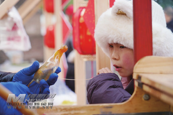 在潼川古城南外街的一家糖畫(huà)小攤邊,孩子們正認(rèn)真挑選著喜歡的圖案,完成后的糖畫(huà)在陽(yáng)光照耀下晶瑩剔透、閃閃發(fā)光。老板劉云一邊繪制著蛇形圖案的糖畫(huà),一邊介紹:“今年是蛇年,所以買蛇形圖案糖畫(huà)的顧客特別多,這幾天生意很好,一天能賣五六百元。”
