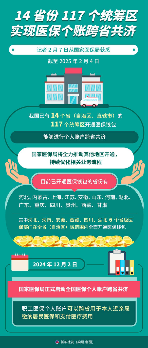 新華社北京2月7日電(記者徐鵬航、溫競?cè)A)記者7日從國家醫(yī)保局獲悉,截至2025年2月4日,我國已有14個?。ㄗ灾螀^(qū)、直轄市)的117個統(tǒng)籌區(qū)開通醫(yī)保錢包,能夠進行個人賬戶跨省共濟。國家醫(yī)保局將全力推動其他地區(qū)開通,持續(xù)優(yōu)化相關業(yè)務流程。