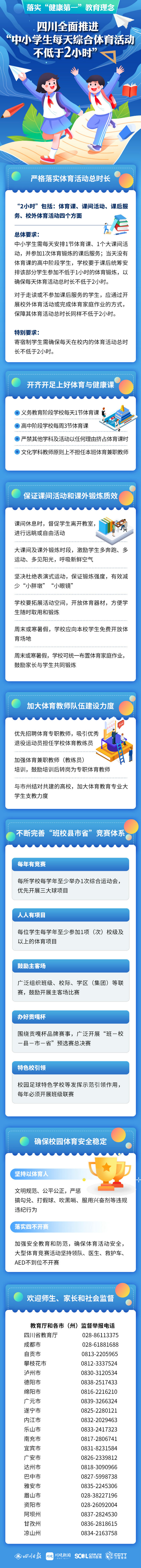 為落實《教育強國建設(shè)規(guī)劃綱要(2024—2035年)》和“健康第一”的教育理念,日前,四川省教育廳印發(fā)了《關(guān)于確保中小學(xué)生每天綜合體育活動時間不低于兩小時的通知》。通知要求,2025年春季學(xué)期開學(xué)后,我省將全面實施“中小學(xué)生每天綜合體育活動時間不低于2小時”,并接受師生、家長和社會的監(jiān)督。教育廳和各市(州)教育主管部門設(shè)立的監(jiān)督舉報電話也一并向社會公布。